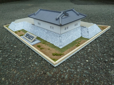 組立完成形は、土台(石垣)部分が縦32センチメートル×横43センチメートル、建屋(多門櫓)部分が縦15センチメートル×横20センチメートルの大きさです。