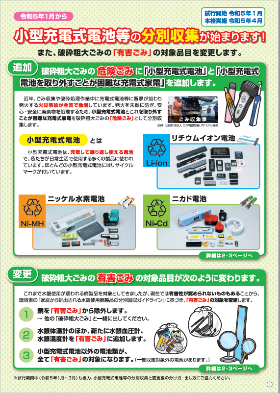 「小型充電式電池等の分別収集」および破砕粗大ごみの「有害ごみ」の対象品目の変更