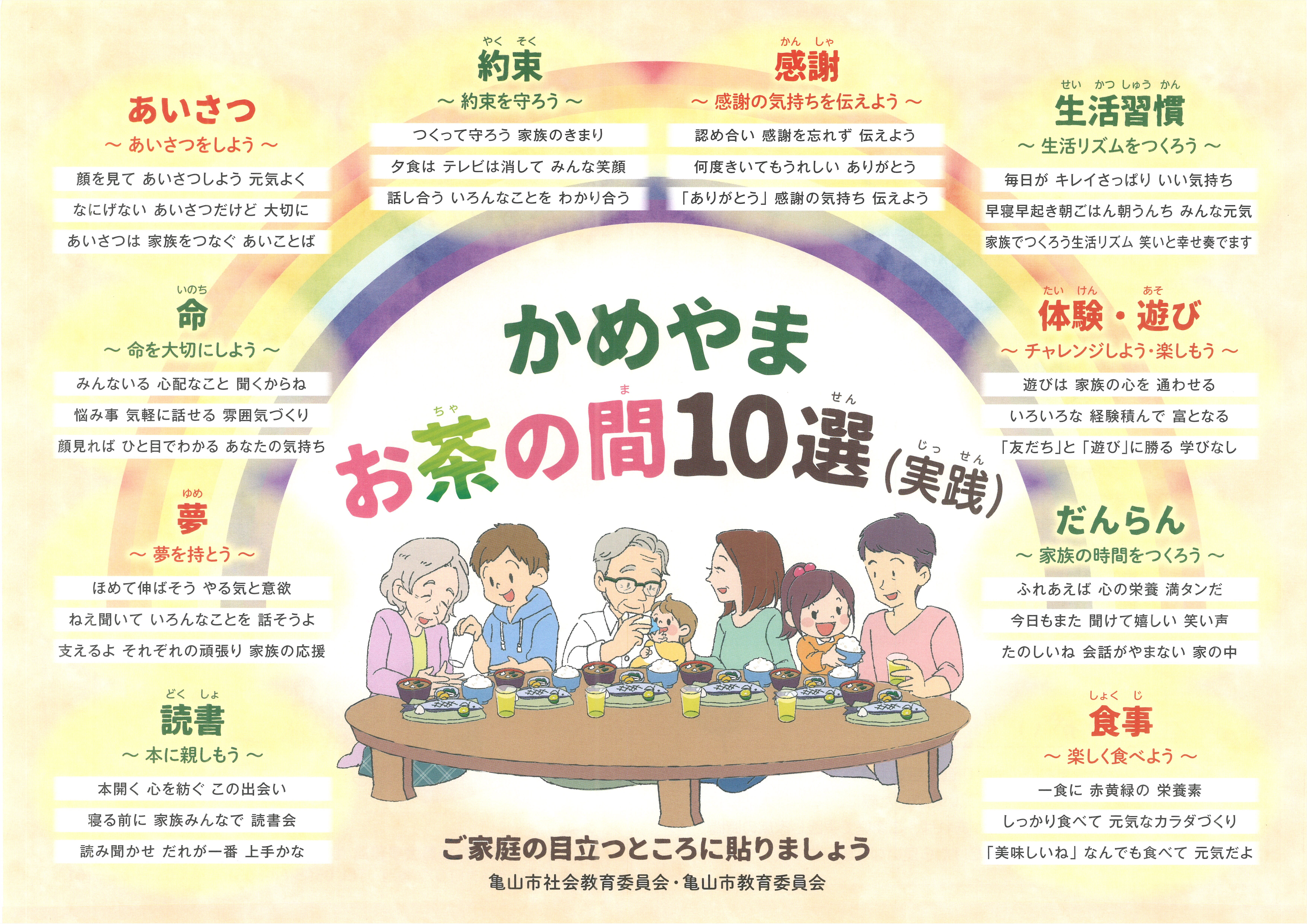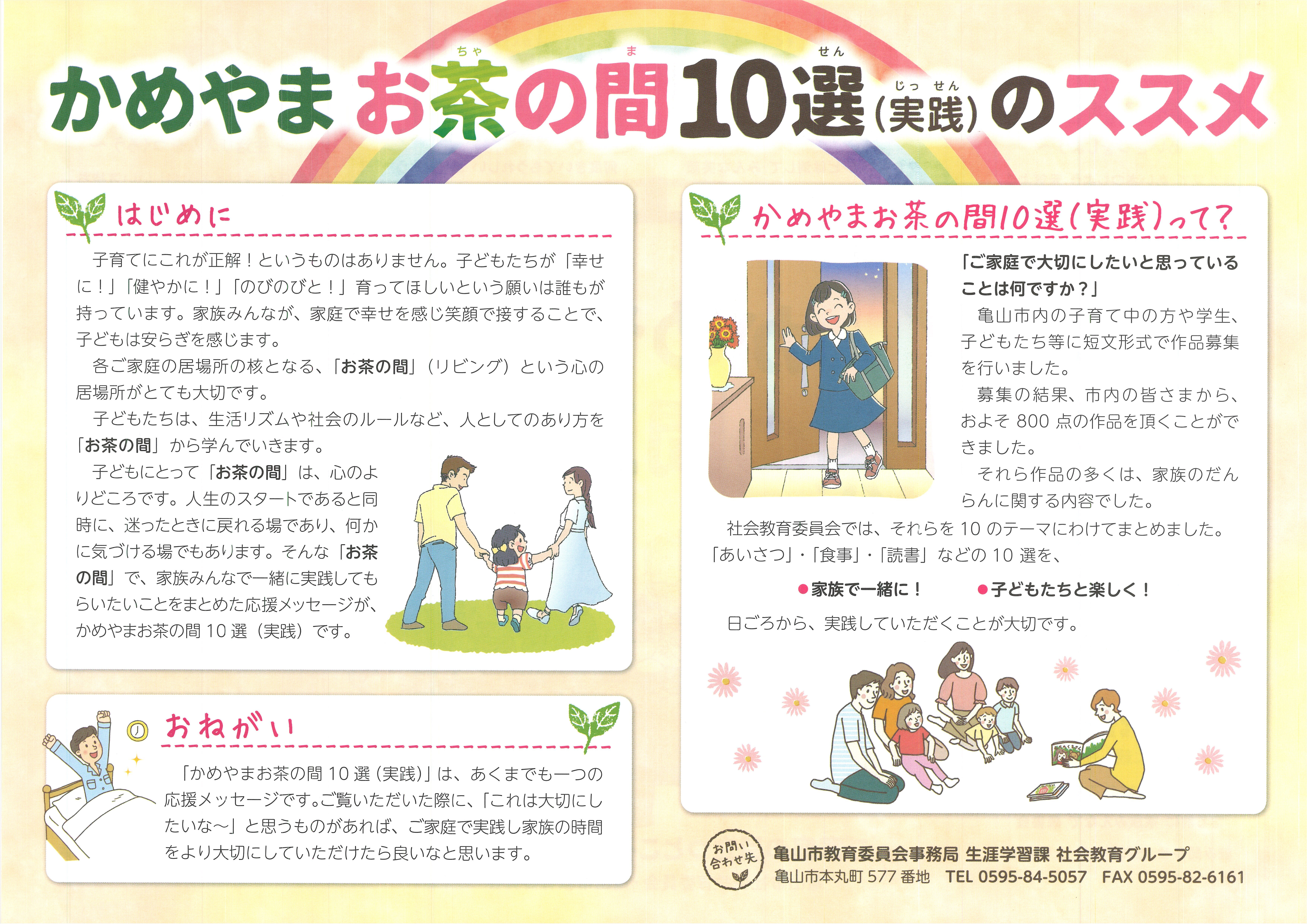 そこで、子育て家庭に向けた応援メッセージとして『かめやまお茶の間10選(実践)』を作成しました。